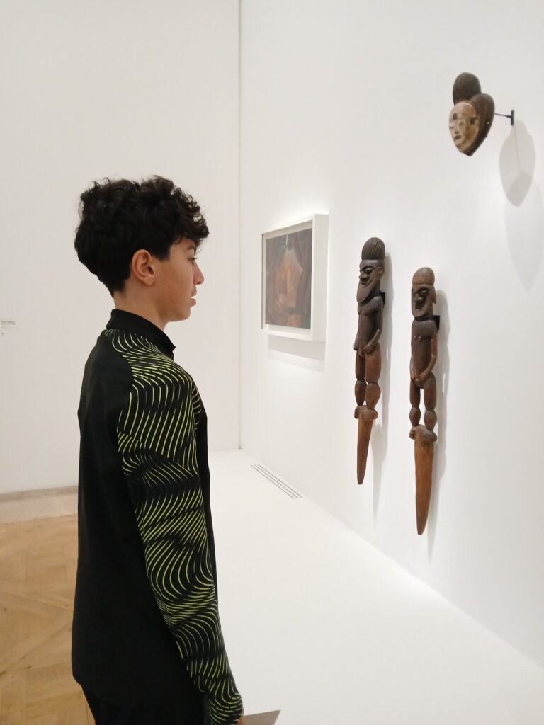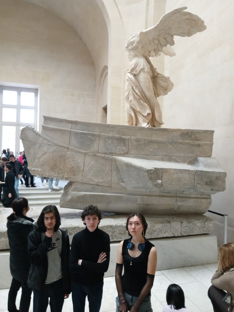 La promenade a débuté dans les galeries de peinture italienne, où les élèves ont admiré des œuvres majeures de la Renaissance, dont le lumineux Couronnement de la Vierge de Fra Angelico. Et bien sûr, impossible de visiter le Louvre sans s’arrêter devant l’incontournable Joconde. Le parcours s’est poursuivi vers les salles de sculpture grecque, avec la majestueuse Victoire de Samothrace trônant au sommet de son escalier monumental, puis vers la galerie des 5 continents.